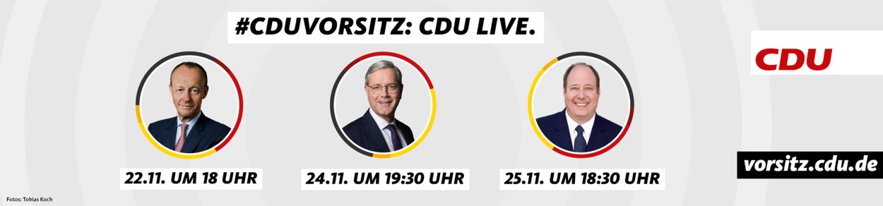 im Rahmen von CDU Live stellen sich die Kandidaten für den CDU-Vorsitz vor. Nutzen Sie diese Möglichkeit für Ihre persönliche Entscheidung.
